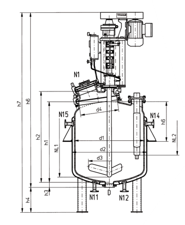 | Nominal capacity (L) | Vessel | Jacket | Exchange surface (m²) | d1 | d2 | d3 | d4 | h1 | h2 | h3 | h4 | h5 | h6 approx. | h7 approx. | Total weight (kg) |